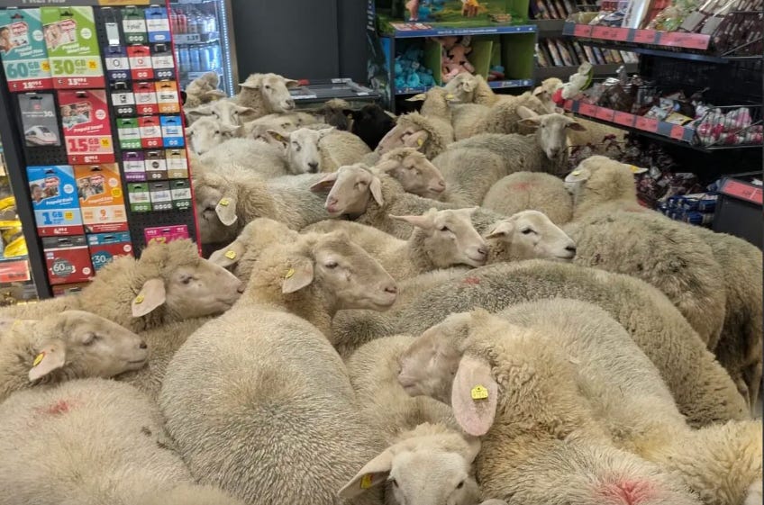 Looking for Wool-worths: Fifty sheep wandered into a grocery store in Germany, forcing staff and customers to climb onto checkout counters for safety, reports The Nightly. A local shepherd said the 50 somehow wandered away from a larger group of 500 sheep he was watching. The sheep broke bottles, knocked items off the shelves and droppings on the floor before leaving the store.