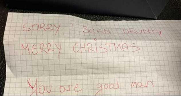 On second thought: A thief who stole two mandolins from a New Jersey music store, then was shamed on social media, returned the items to the store with a note that said, “SORRY, I BEEN DRUNK, MERRY CHRISTMAS.” Lark Street Music posted on Facebook that “the thief surreptitiously opened the front door and returned them in 2 shopping bags.” The store had previously posted video of the mandolin theft, sparking a social media hunt for the perpetrator. It seemed to work. “Your re-posts and pressure definitely made him realize the walls were closing in,” the store said.