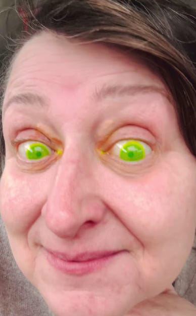 Emerald Isle: A woman in Ireland took to Instagram to explain how she got flourescent green eyes from a routine optical exam. Magarita Wargola said a technician failed to ask her if she was wearing contacts before applying a contrast dye in her eyes. Her eyes immediately turned bright green. “We both panicked,” she said. Despite many attempts to clean them, the contacts were permanently stained, but her eyes were not harmed. Wargola said she might use the contacts on St. Patrick’s Day.