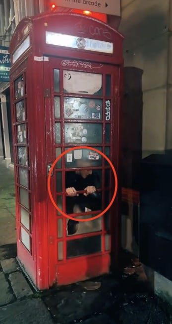 Stuck, part I: A young man in England who wanted to order kebab got trapped in an ornamental red Britsh phone booth when the door locked behind him, reports the Manchester Evening News. “His mates were laughing but they couldn’t get him out.,” said a witness. Video shows firefighters prying the door open to free the man. The booth did not have a phone.